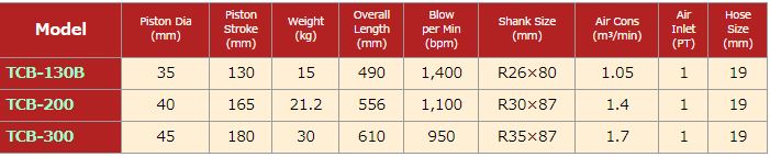 Máy Đục hơi TCB – 200 là một loại máy đục phá bê tông khí nén được sử dụng để khoan – đục bê tông, chất rắn hoặc đá…trong nhiều ngành công nghiệp như khai thác mỏ, làm đường, khai thác đá, đào mương, công trình xây dựng… Đục hơi TCB – 200 là một loại máy loại mạnh mẽ, có thể khoan đứng, nghiêng, khoan nổ mìn với phương pháp khoan khô hoặc khoan ướt. Đục hơi TCB – 200 được sản xuất bằng vật liệu chất lượng cao, kỹ thuật tiên tiến hàng đầu Nhật Bản, nên sản phẩm có độ bền cao, chống gỉ và chống va đập tốt.