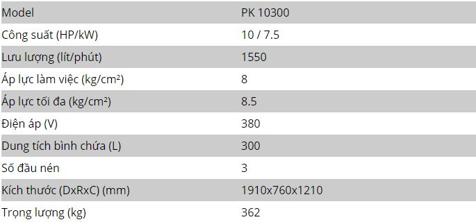 - Thông số kỹ thuật của máy nén khí piston Puma 10HP Đài Loan