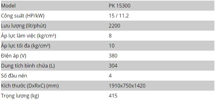 - Thông số kỹ thuật của máy nén khí piston Puma 15HP Đài Loan