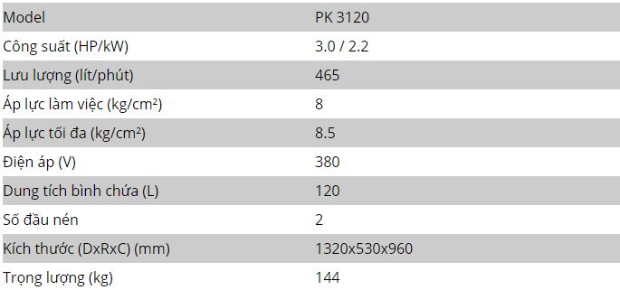 - Thông số kỹ thuật của máy nén khí piston Puma 3HP Đài Loan